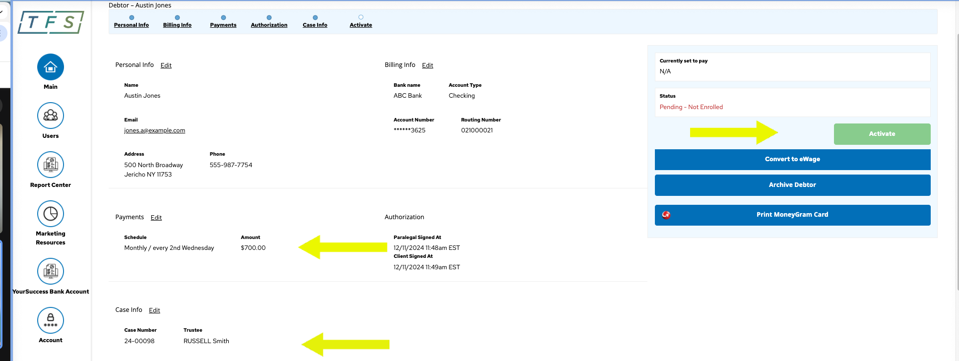 Once a case is filed, easily locate your clients in the TFS Portal using the search bar—just enter their name or case number. You can also find them on the Pending Activations screen. From there, access key details like trustee information and payment schedules to quickly activate their account and keep payments moving on time—all within one secure, streamlined platform.