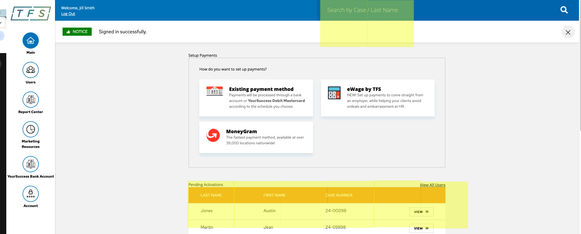 1. Simply log in, type your client's name or case number into the search box or locate them in the Pending Activation list